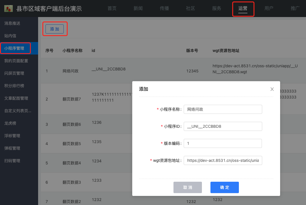 - 将小程序名称、小程序id、版本编码、wgt资源包地址交给融媒体中心小编,创建客户端内可访问的小程序链接,具体步骤为:进入客户端管理后台目录「/运营/小程序管理」,点击左上方添加按钮进行添加,将前述四项逐一填入,确定添加。
